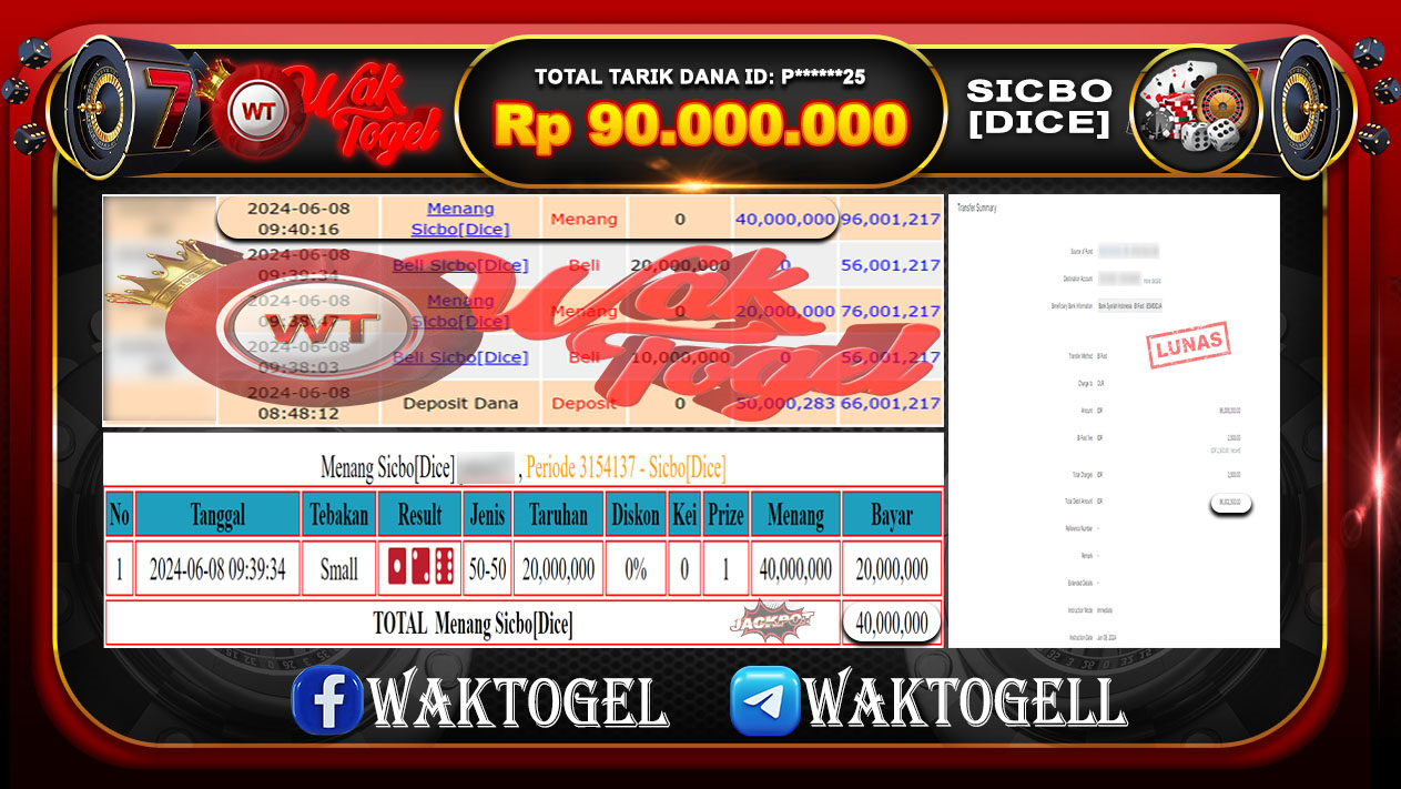BUKTI PEMBAYARAN CASINO WAKTOGEL RP. 90.000.000 – GAME : SICBO DICE (USER ID : P*****25) TANGGAL|08-06-2024| CASH LUNAS !