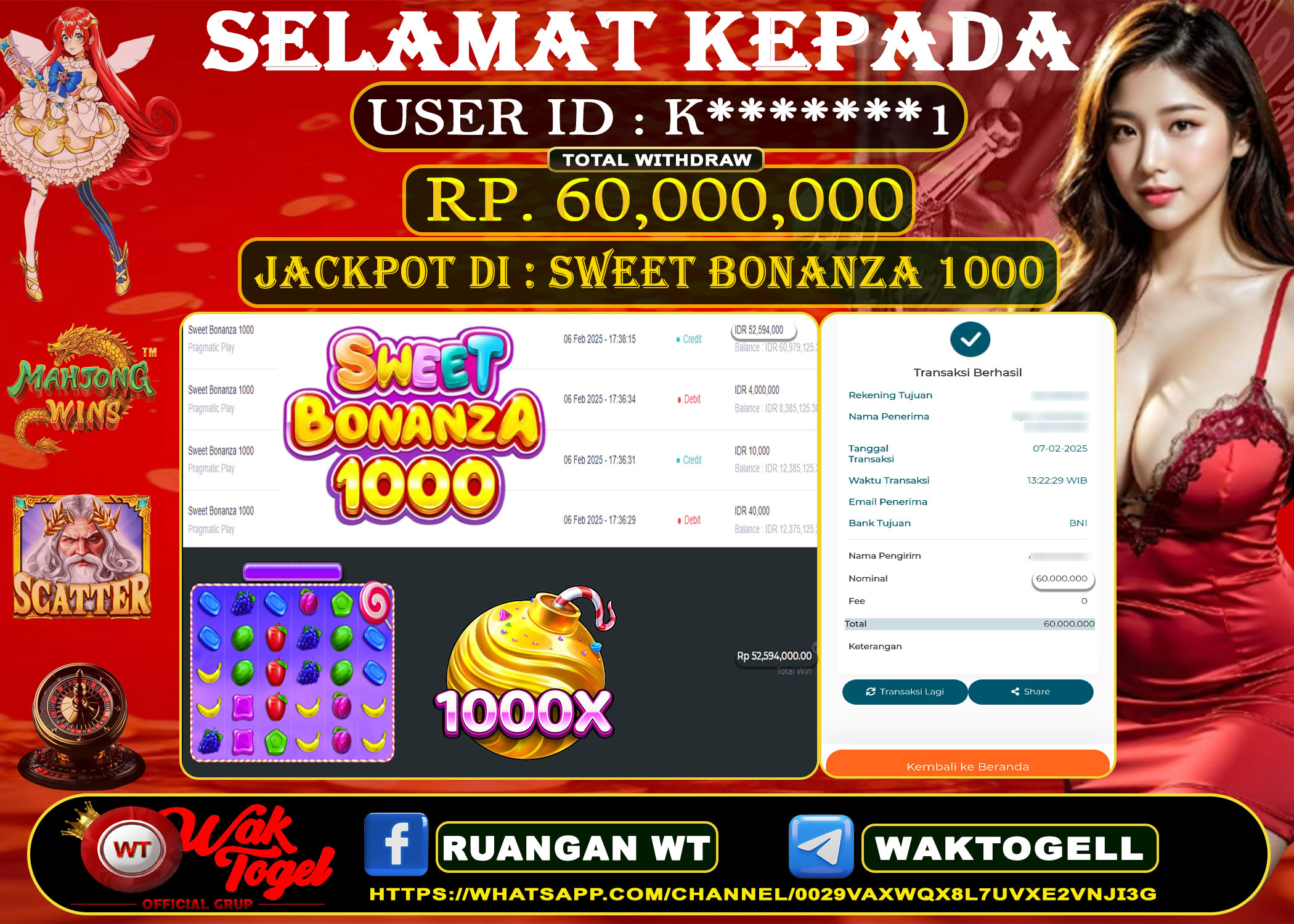 BUKTI PEMBAYARAN SLOT WAKTOGEL RP. 60,000,000 – GAME : SLOT SWEET BONANZA 1000 (USER ID : K*******1) TANGGAL |07-02-2025| CASH LUNAS !