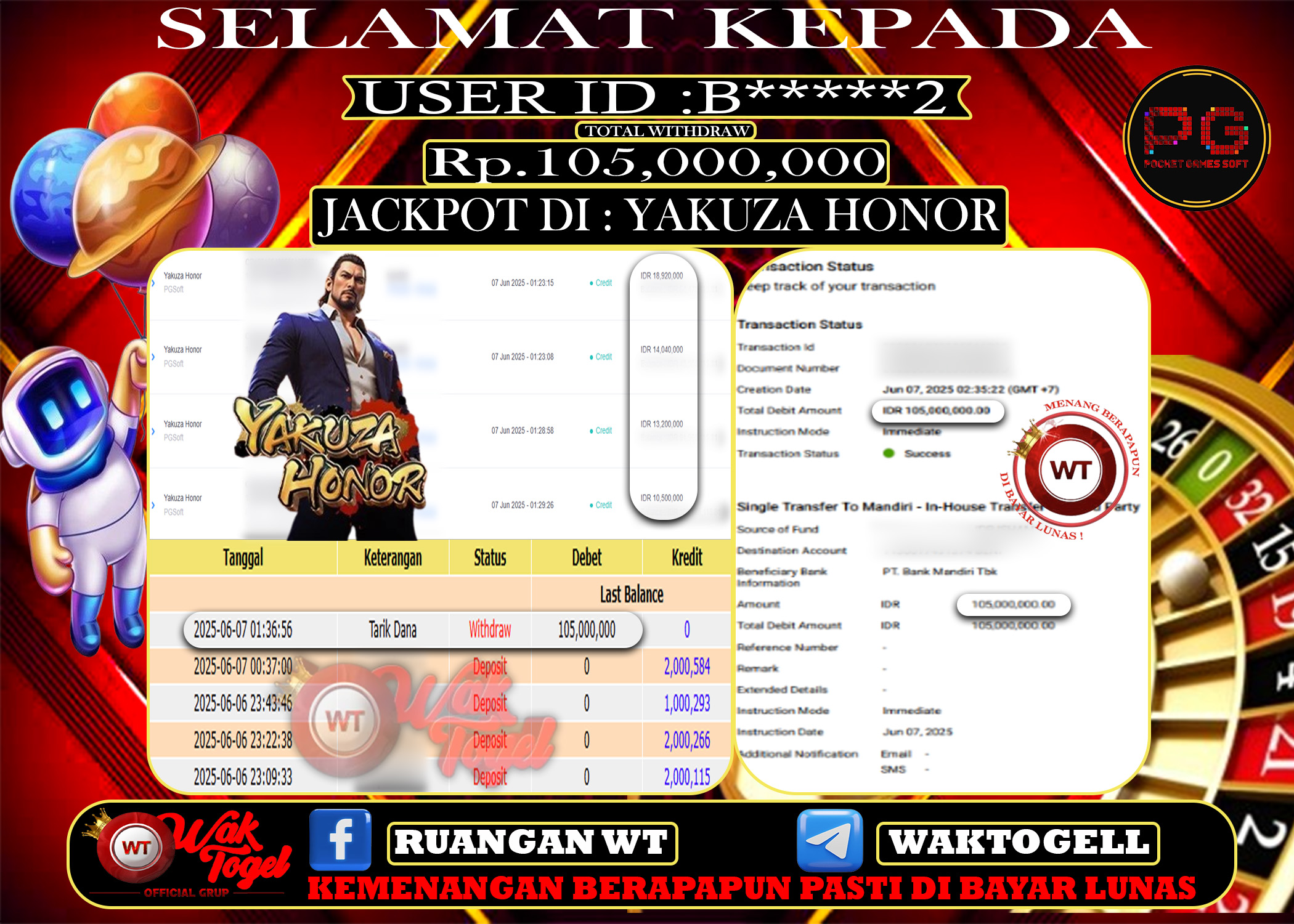 Kami ucapkan selamat kepada user ID : B*****2 telah withdraw sebesar Rp. 105,000,000 di game : SLOT YAKUZA HONOR. Bukti pembayaran jackpot member Waktogel kami bayar lunas dengan waktu paling singkat.