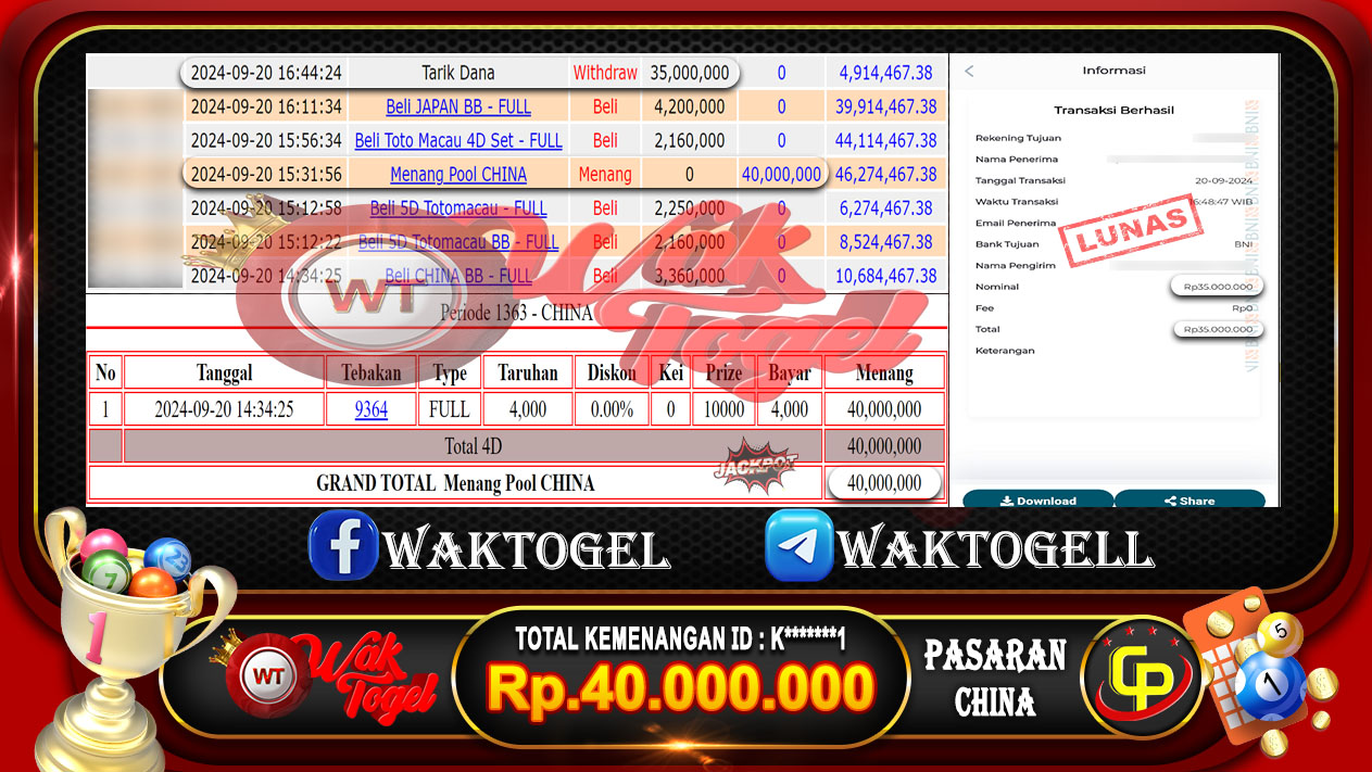 BUKTI PEMBAYARAN CHINA WAKTOGEL BUKTI PEMBAYARAN CHINA WAKTOGEL RP. 40.000.000 – GAME : TOGEL CHINA POOLS (USER ID : K*******1) TANGGAL |20-09-2024| CASH LUNAS ! […]
