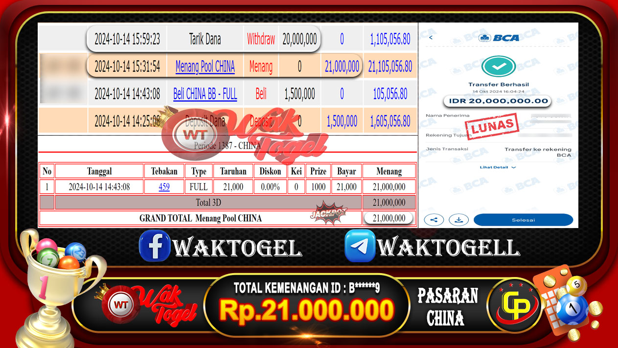 BUKTI PEMBAYARAN CHINA WAKTOGEL BUKTI PEMBAYARAN CHINA WAKTOGEL RP. 21.000.000 – GAME : TOGEL CHINA POOLS (USER ID : B******9) TANGGAL |14-10-2024| CASH LUNAS ! […]