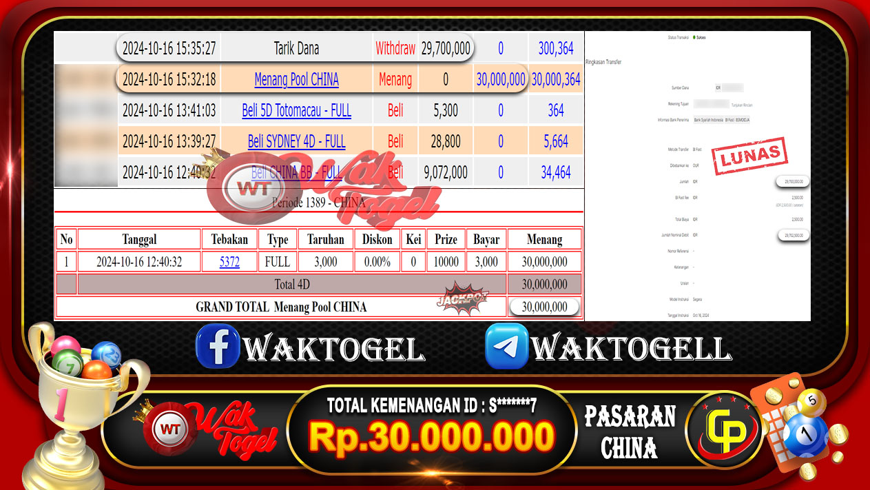 BUKTI PEMBAYARAN CHINA WAKTOGEL BUKTI PEMBAYARAN CHINA WAKTOGEL RP. 30.000.000 – GAME : TOGEL CHINA POOLS (USER ID : S*******7) TANGGAL |16-10-2024| CASH LUNAS ! […]