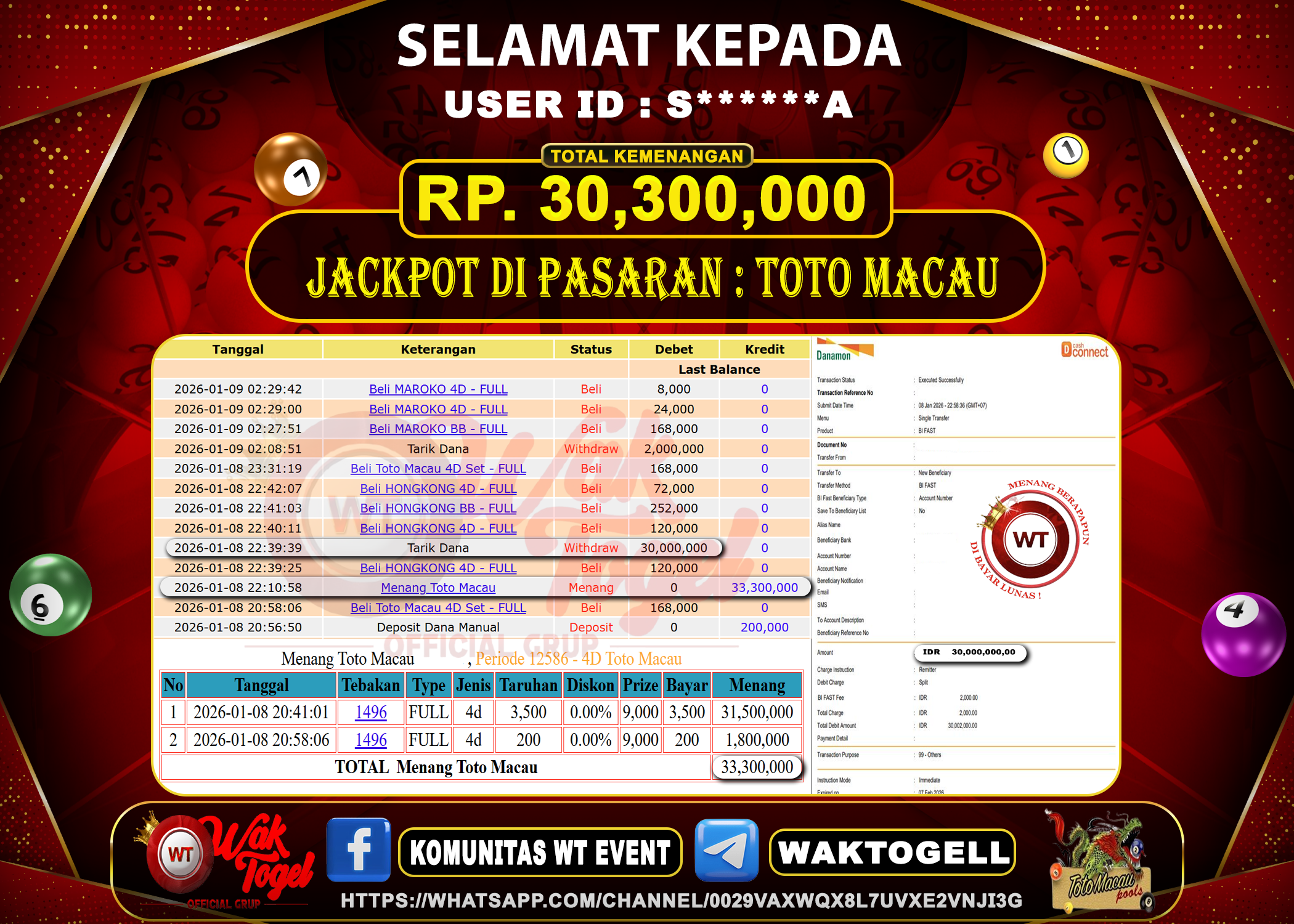 BUKTI PEMBAYARAN TOTO MACAU WAKTOGEL BUKTI PEMBAYARAN TOTO MACAU WAKTOGEL RP. 52,600,000 – GAME : TOGEL TOTO MACAU POOLS (USER ID : S********3) TANGGAL |11-01-2026| […]