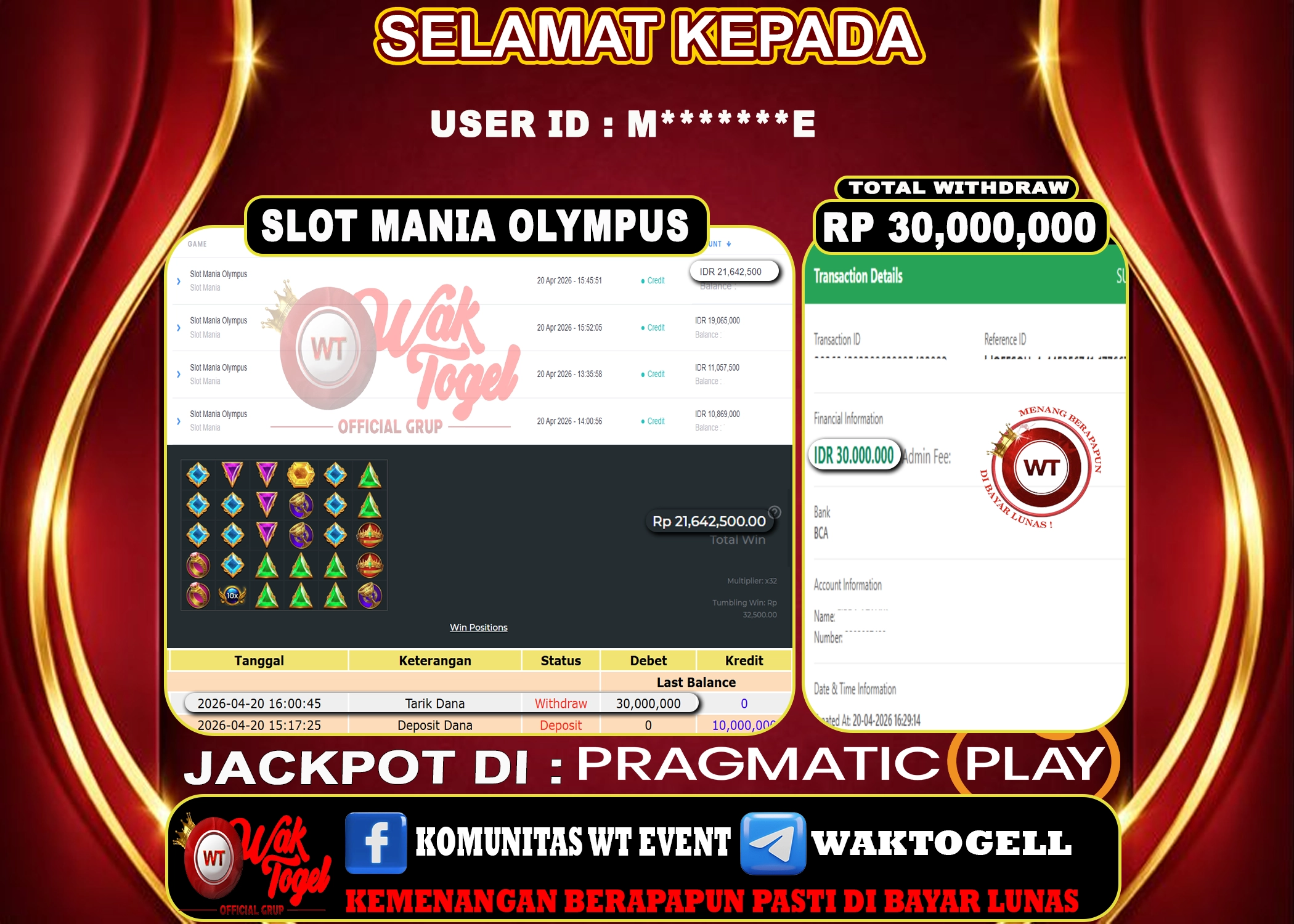 JACKPOT SLOT WAKTOGEL BUKTI PEMBAYARAN SLOT WAKTOGEL By JPWT April 20, 2026 0 comments 2 min read BUKTI PEMBAYARAN SLOT WAKTOGEL BUKTI PEMBAYARAN SLOT WAKTOGEL RP. 30,000,000 – GAME : SLOT MANIA OLYMPUS (USER ID : M*******E) TANGGAL |04-20-2026| CASH LUNAS ! […]