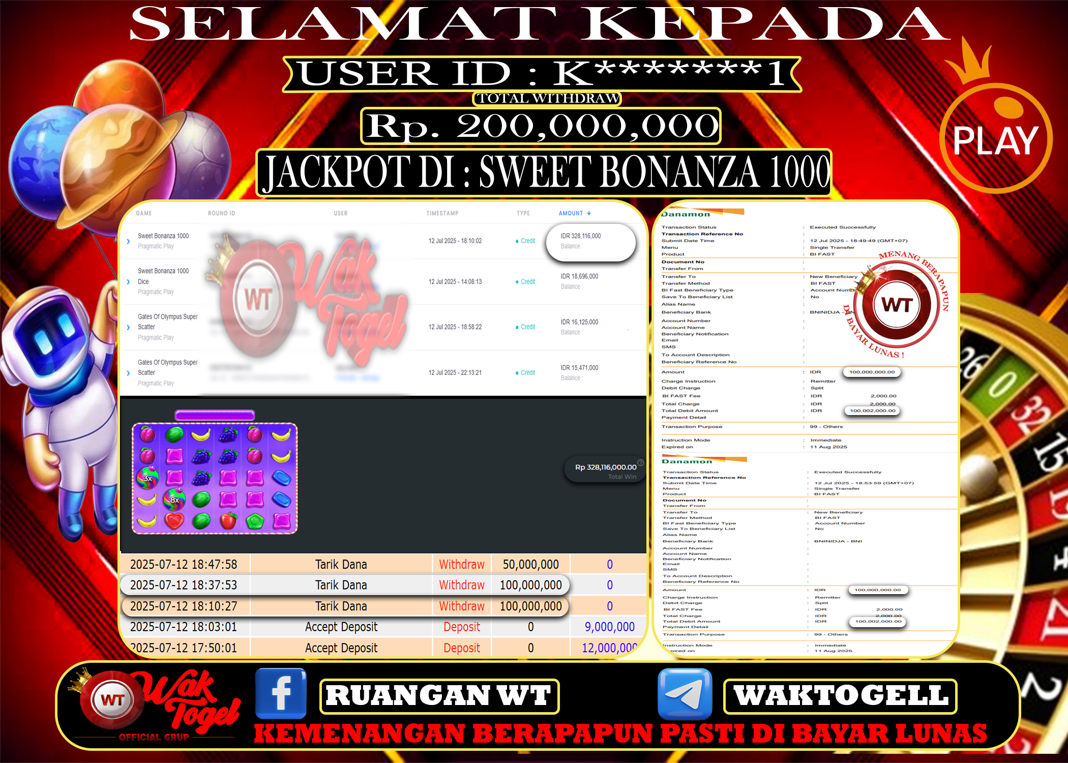 JACKPOT SLOT WAKTOGEL BUKTI PEMBAYARAN SLOT WAKTOGEL By JPWT Juli 13, 2025 0 comments 2 min read BUKTI PEMBAYARAN SLOT WAKTOGEL BUKTI PEMBAYARAN SLOT WAKTOGEL RP. 200,000,000 – GAME : SLOT SWEET BONANZA 1000 (USER ID : K*******1) TANGGAL |12-07-2025| CASH LUNAS […]