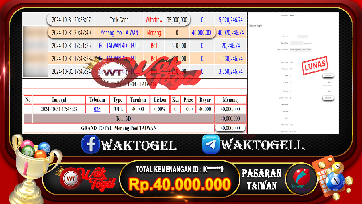 BUKTI PEMBAYARAN TAIWAN WAKTOGEL BUKTI PEMBAYARAN TAIWAN WAKTOGEL RP. 40.00.000 – GAME : TOGEL TAIWAN POOLS  (USER ID : K*******9)TANGGAL|31-10-2024| CASH LUNAS ! Kami ucapkan […]